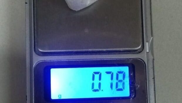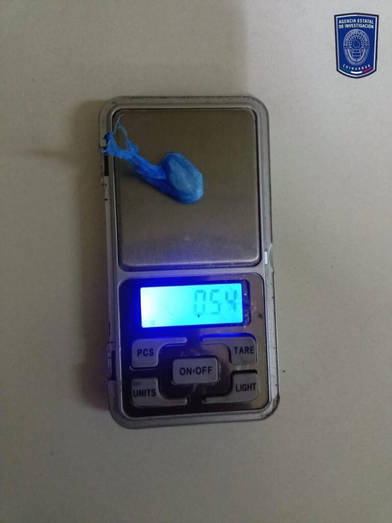 Al realizarle una inspección, se le encontró entre sus pertenencias un envoltorio de plástico transparente que contenía una sustancia granulosa y cristalina, con un peso de .54 gramos de cristal.