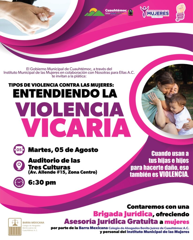 🔎 El Gobierno Municipal de Cuauhtémoc a través del Instituto Municipal de las Mujeres en colaboración con Nosotras para Ellas A.C. te invitamos a esta plática informativa donde hablaremos sobre los tipos y modalidades de violencia contra las mujeres, con especial enfoque en la violencia vicaria.