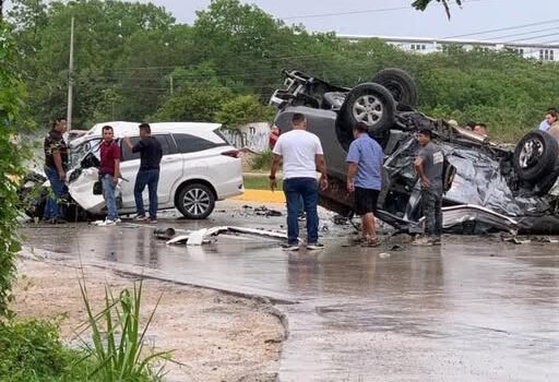El accidente se presentó alrededor de las nueve de la mañana del martes en el bulevar Luis Donaldo Colosio, de Cancún, Quintana Roo. Esto cuando una camioneta gris perdió el control por el pavimento mojado, invadió el carril contrario y fue impactada por otro vehículo blanco, informaron medios de aquella ciudad.