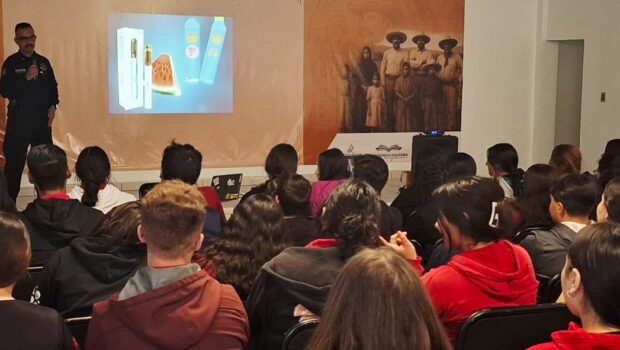 Cuauhtémoc, Chih.— En el marco de las acciones de prevención y orientación a la juventud, personal de la Dirección de Seguridad Pública Municipal, a través de la unidad D.A.R.E., impartió una plática informativa sobre los riesgos del uso de vapeadores a estudiantes de la Preparatoria Justo Sierra, en Álvaro Obregón.