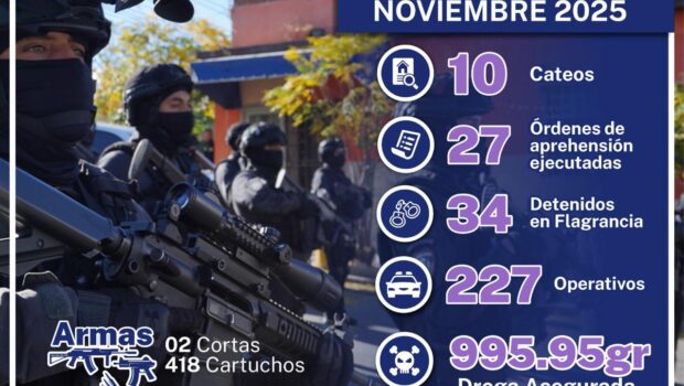 - 30 personas fueron reintegradas a sus hogares; 15 autos recuperados y 17 asegurados para investigación; hubo 10 cateos por actividades de narcomenudeo; 27 órdenes de aprehensión cumplimentadas y 34 personas detenidos en flagrancia en 227 operativos durante el mes