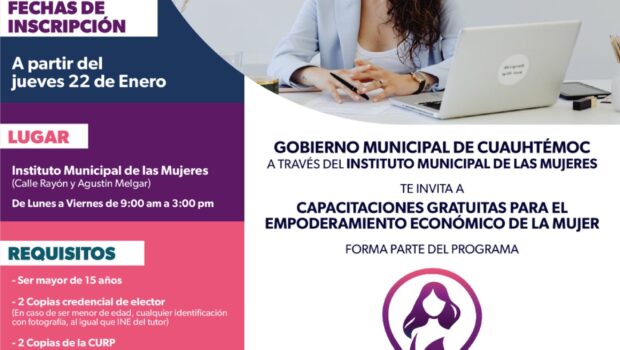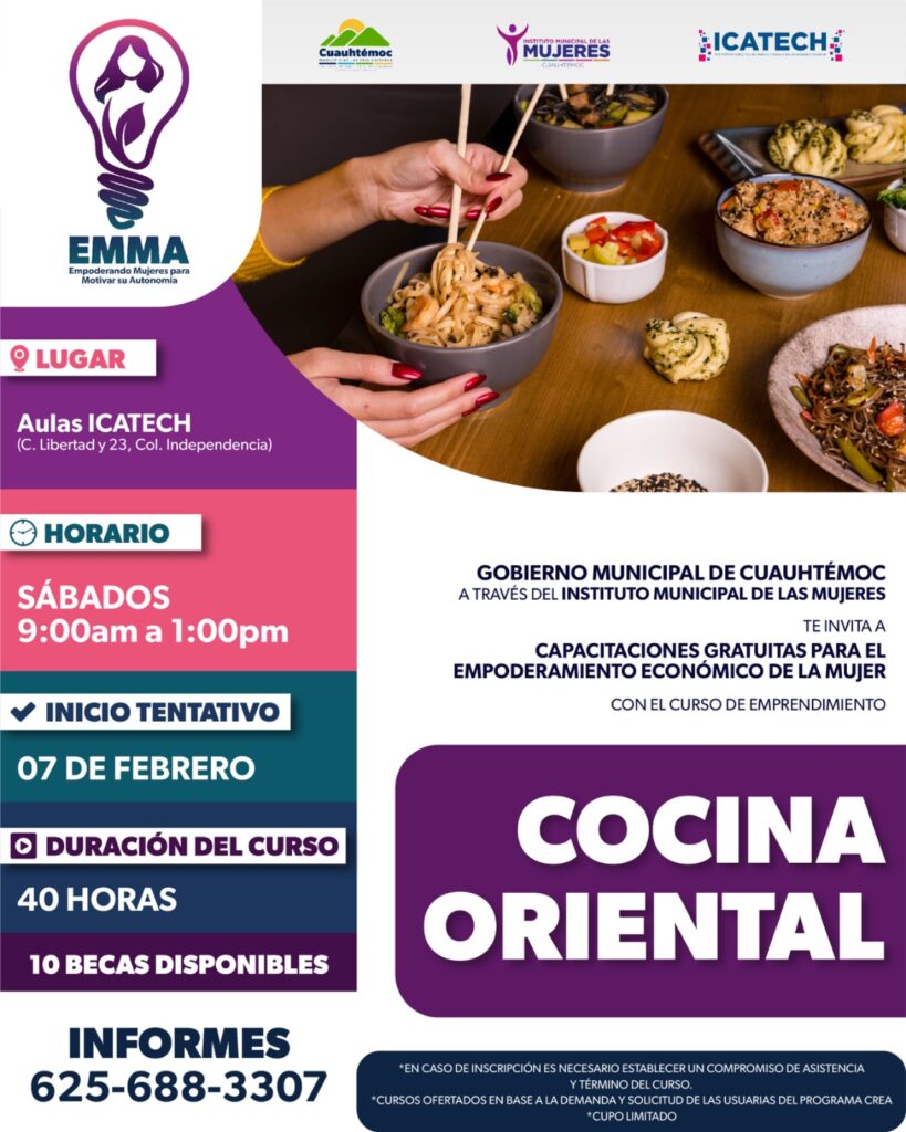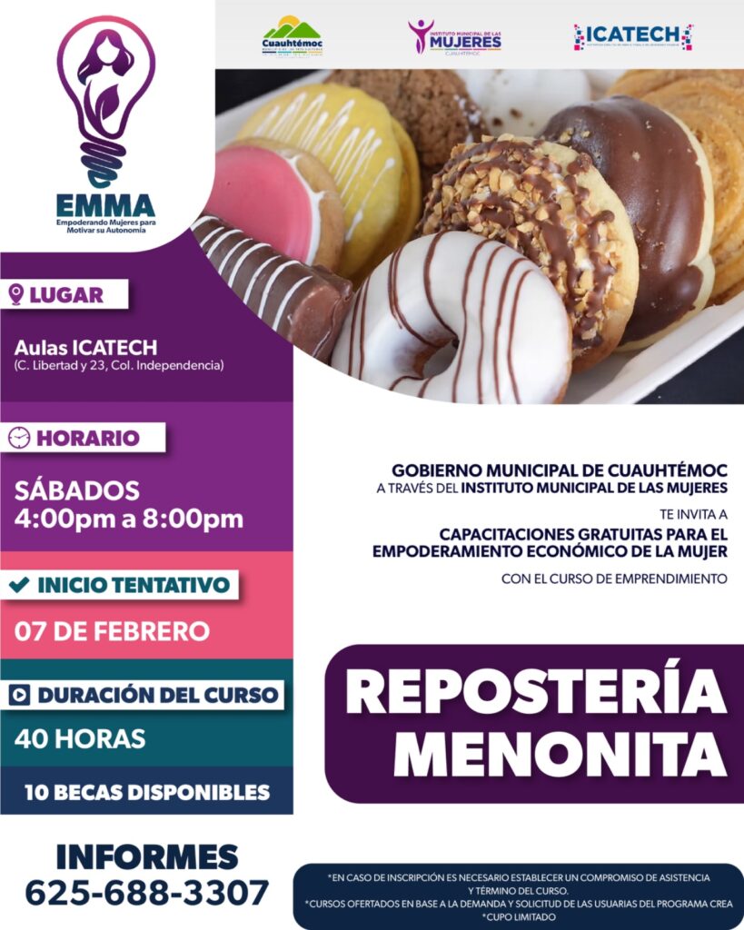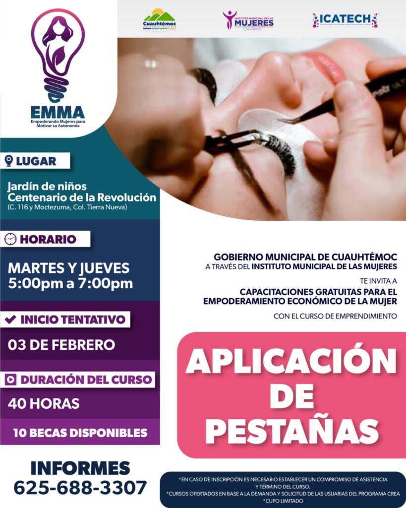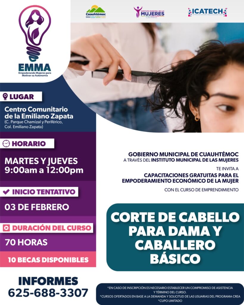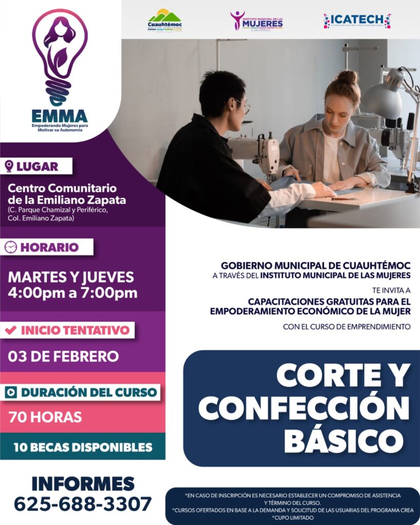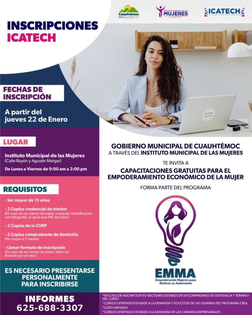 El Gobierno Municipal de Cuauhtémoc, a través del Instituto Municipal de las Mujeres y su Programa EMMA, invita a las mujeres a participar en las capacitaciones gratuitas para el fortalecimiento y empoderamiento económico, impartidas por ICATECH.