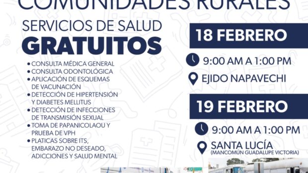Cuauhtémoc.– Los servicios de salud gratuitos llegarán esta semana al ejido Napavechi y al mancomún de Santa Lucía, a través de las Unidades Médicas Móviles, con el objetivo de acercar atención médica a las comunidades.