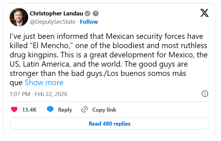 El subsecretario de Estado y exembajador de Estados Unidos, Christopher Landau, felicitó a las fuerzas de seguridad mexicanas por el operativo donde fue abatido Nemesio Oseguera, “El Mencho”, líder del Cártel Jalisco Nueva Generación (CJNG).