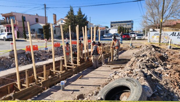Actualmente, trabajan en los tramos de las calles Segunda y Ojinaga, y Sexta y Ojinaga, por lo que se solicita la comprensión de la población. En la Sexta se colocó una estructura de madera, este jueves se realizará el colado de cemento, y se espera que en 15 días queden terminadas las acciones.