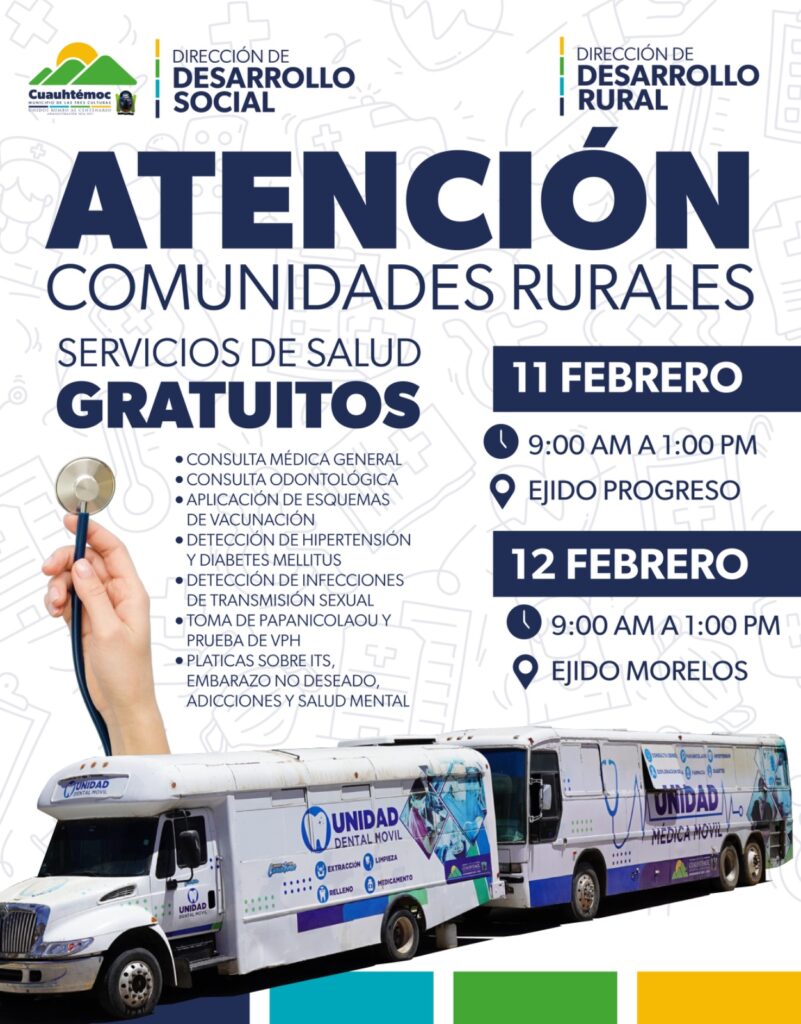 ¡Atención Progreso y Morelos! Esta semana llegan servicios de salud gratuitos para todos sus habitantes. Checa en este flyer las atenciones que estarán a disposición, en un esfuerzo conjunto de Desarrollo Social y Desarrollo Rural del Municipio de Cuauhtémoc.