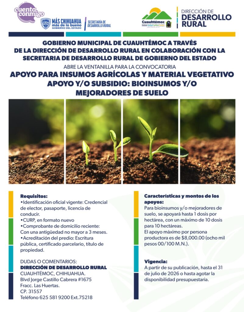 Atención productores. Está abierta la convocatoria de Apoyo para Insumos Agrícolas y Material Vegetativo, Apoyo y/o Subsidio: Bioinsumos y/o Mejoradores de Suelo. Checa los requisitos y acude a la Dirección de Desarrollo Rural.