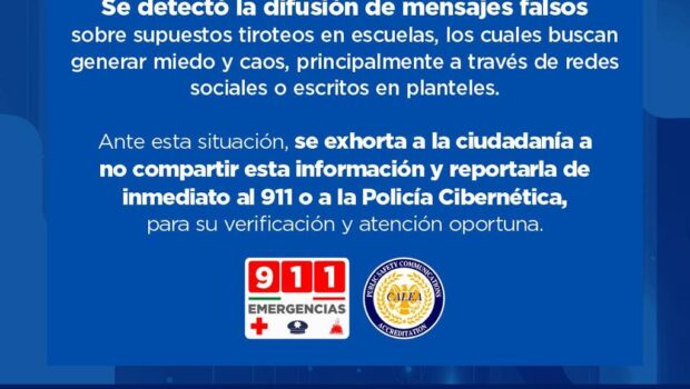Ante esta situación, la el titular de la SSPE, Gilberto Loya, exhortó a la ciudadanía a no difundir este tipo de mensajes y a reportarlos de inmediato al número de emergencias 911, a fin de que las autoridades realicen la verificación correspondiente y activen los protocolos de atención.