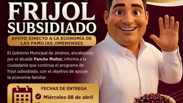 Gobierno Municipal de Jim茅nez. – El presidente municipal de Jim茅nez, Pancho Mu帽oz, dio a conocer que, como parte de las acciones implementadas por el Gobierno Municipal en apoyo a la econom铆a de las familias, durante esta semana se estar谩 llevando a cabo el programa de frijol subsidiado.